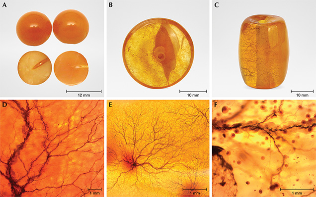 As early as 2012, foreign suppliers tried to introduce irradiation-treated amber into the Chinese market. Due to the booming demand for natural golden and beeswax amber in the Chinese market, amber manufacturers had little interest in the irradiated products. After the market cooled in late 2015, irradiated amber emerged as a new variety (figure 1). Some irradiated amber (containing microstructure defects in the original material before treatment) was accompanied by dendritic inclusions with color enhancement or change (figure 1B). The amber materials used for irradiation treatment were selected from Baltic amber. After irradiation, the red color was usually internally uniform when the weathered skin was polished. Due to differences in original bodycolor and flow pattern, the irradiated amber with the superimposed red color can be red, orange-red, orange-yellow, or yellow-brown, or have a red-white alternating pattern (figure 1C, far right). Early irradiated amber from the end of 2015 was easy to identify due to the presence of dendritic inclusions. Recently, the generation of dendritic inclusions has been suppressed and the quality of the samples has improved (figure 1C). The dendritic inclusions are basically inhibited, and the irradiated amber will not produce them as long as there are no cracks or defects on the surface that can be broken down by the irradiation source. Moreover, the enhanced color via irradiation treatment is much more natural (figure 1D).