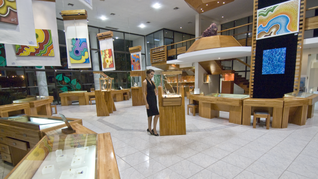 Minerales y Metales del Oriente 的零售业务销售该公司 Anahí 矿源制成的紫黄晶首饰。 这张照片拍摄的是 M&M 公司精品陈列室的内景。