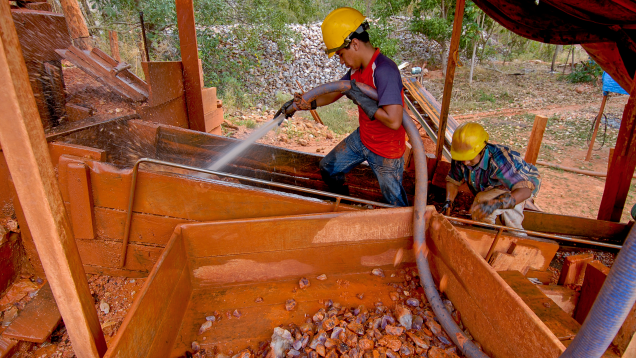 这名工人正在预洗从矿区开采出来的原石。 不同重量的沉积物放置在蓄水池中,防止污染矿山的下游水体。
