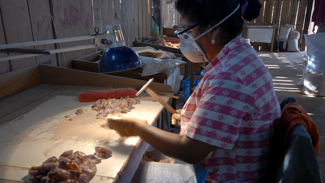 洗涤后,材料被装到袋里并送至预分类保护设施。 这里有 20 名员工开始评估材料。 有些经过捶打或捣碎,以露出宝石材料,减少重量。 Anahí 没有对任何材料进行刻面处理。预分类的目的是简化后面的切割过程。该矿自诩遵守了关于炸药使用的政府法规。 矿工们还穿上防护装备,如安全帽、手套(石英可以像破碎的玻璃那样造成割伤)、眼睛防护用具和口罩,以保护穿着者免受空气中石英颗粒的伤害。