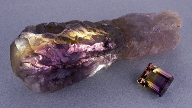 この透明クォークはアメジストとシトリンの両方の色があり、アメトリンやアメジスト、シトリンと呼ばれています。