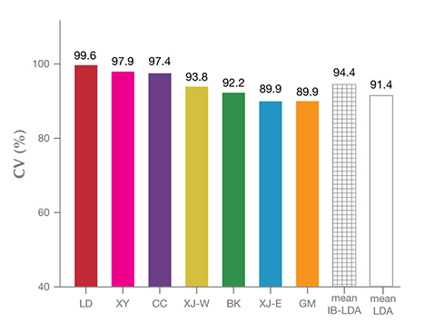 This process should be repeated until all the unseparated blocks can be identified. The number of test sets with the correct classification divided by the number of the total test sets is the accuracy rate (AR) for such blind testing. The same blind test is performed five times on different test sets, and the average AR is calculated. We note that the AR value obtained is generally consistent with the CV value calculated in the first step of IB-LDA, as shown in table A-1.