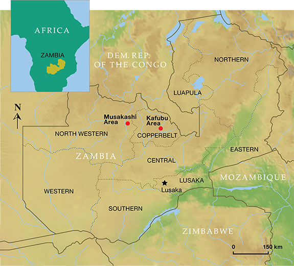 Box A: Emeralds from Musakashi, Zambia The most interesting characteristic was the presence in all the stones of three-phase inclusions, consisting of a bubble and a cube-shaped crystal in a liquid, almost identical to those commonly seen in Colombian emeralds. Zwaan et al. also identified sphene, iron oxides, feldspar, and quartz as mineral inclusions. Production reportedly resumed in 2006, starting with hand tools and progressing to the use of an excavator for a few months in 2009 (Klemm, 2009 and 2010). These reports, published after visits to Musakashi in July 2009 and August 2010, provide details adding to the history of emerald mining there. Location and Access Production and Distribution ![]() Figure A-1. This map shows the location of the Kafubu and the Musakashi emerald deposits. |