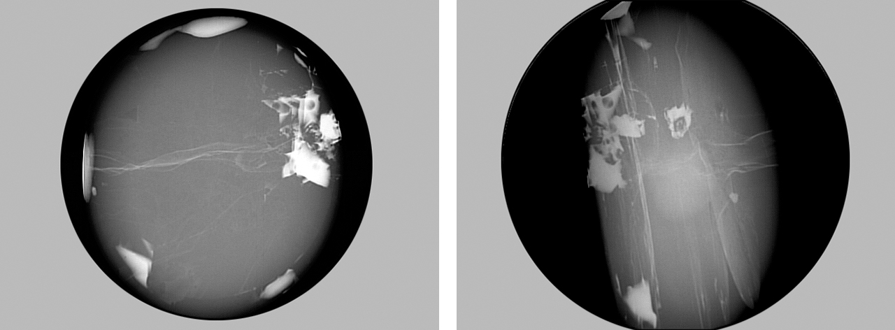 Using X-ray imaging analysis (figure 3), it was clear that the fractures and multiple cavities had been filled with lead glass, and this finding was confirmed by EDXRF. These properties would have been extremely difficult to see under normal visual magnification.