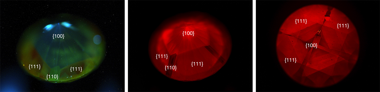 The strong short-wave UV radiation of the DiamondView (figure 3) showed red and yellowish green fluorescence in the red and green samples, respectively. Furthermore, the presence of both cubic {100} and octahedral {111} growth sectors in the DiamondView images suggested that the specimens formed with a relatively high growth rate that facilitated cubic and octahedral development simultaneously, a strong indicator of synthetic origin (Winter 2015 Lab Notes, pp. 429–430).