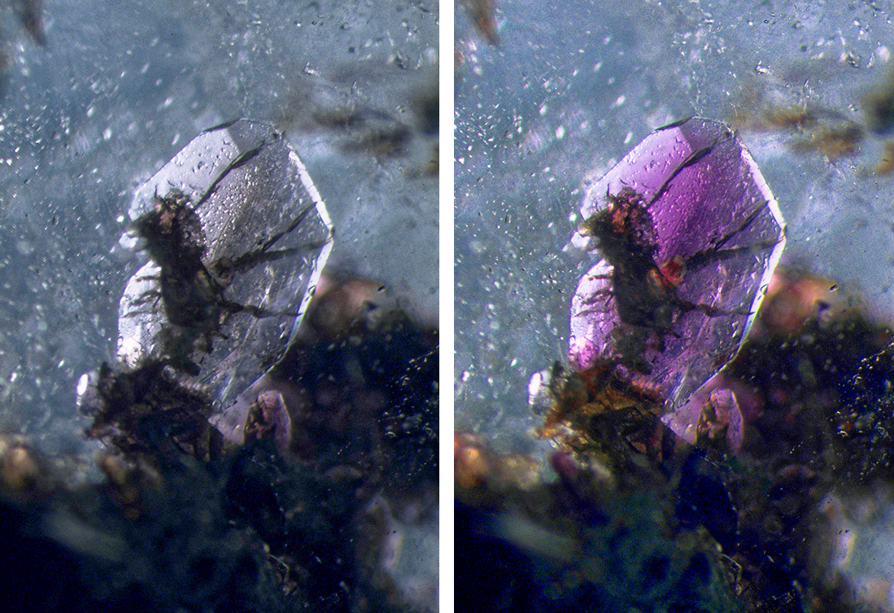 The axinite inclusions themselves displayed the typical bladed habit expected for this mineral. When examined with polarized light, they also showed pronounced pleochroism, from a light brown (figure 2, left) to a more intense pinkish purple (figure 2, right). This represents the first visual record of axinite inclusions in quartz published in the gemological and mineralogical literature.