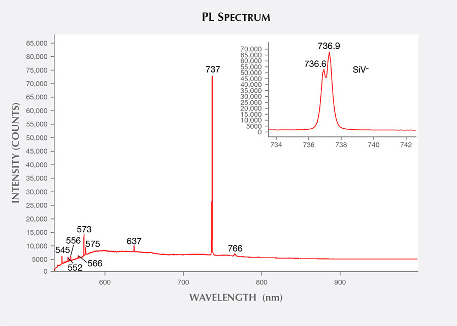 An absorption spectrum collected by micro-FTIR identified it as a type IIa synthetic diamond, with no N-related absorption. A weak 270 nm absorption band usually associated with synthetic origin was detected in the UV-Vis spectrum. With 532 nm laser excitation at liquid nitrogen temperature, the PL spectrum showed strong SiV– center double peaks at 736.6 and 736.9 nm (figure 4), indicating a CVD synthetic. A clear 978 nm emission also appeared in the PL spectrum with 785 nm laser excitation; the assignment of this emission is unknown. The green fluorescence was attributed to an H3 center, which means the specimen was HPHT-treated after growth.
