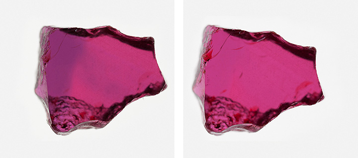 Mozambique is one of the most important sources of ruby today, with the Montepuez mine producing material ranging from light to dark purplish red. To improve their color, Montepuez rubies are heated at low temperatures to remove the purplish component—caused by blue color zoning—and create a more attractive and desirable red color. For this study, 47 samples were selected for heat treatment in air (oxidizing environment) at different temperatures and varying durations. The samples were heated to 600, 700, 800, and 900°C for 2 hours and 40 minutes, 8 hours, or 24 hours. The results showed no significant change to the blue color zoning when heated to 600 or 700°C over any of the time frames chosen; however, the blue component was reduced when heated to a minimum of 800°C for 2 hours and 40 minutes (figure 1).
