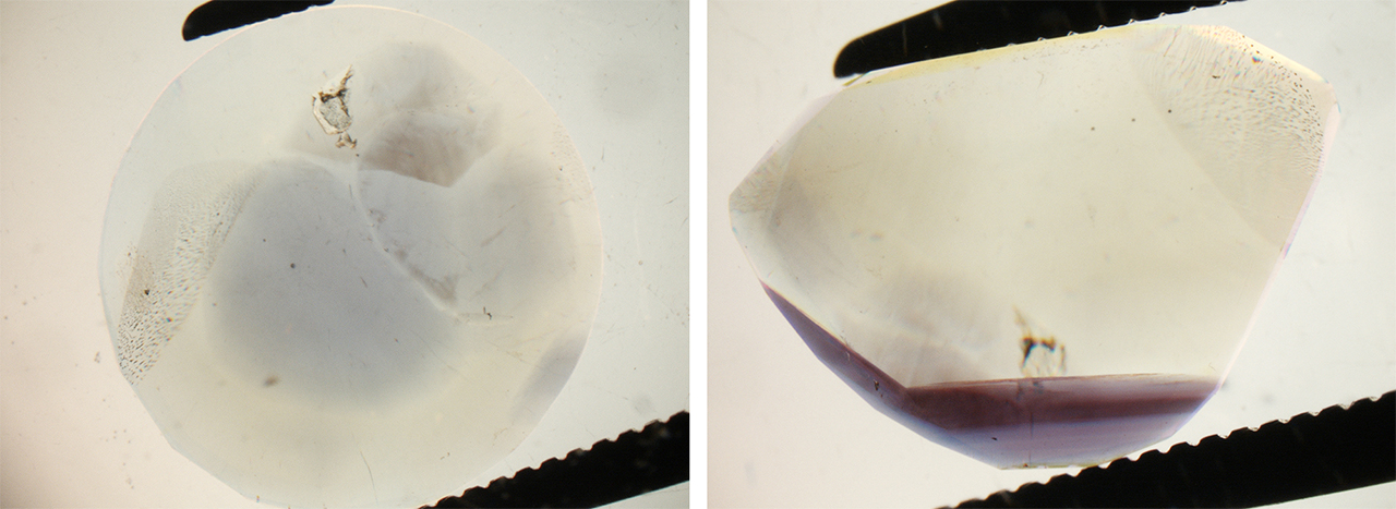 Microscopic examination revealed natural fingerprints, needles, zoned particles, and color zoning, along with internal growth features. Interestingly, the stone showed a thin color zone very close to some of the pavilion facets and culet when immersed in methylene iodide (figure 2).