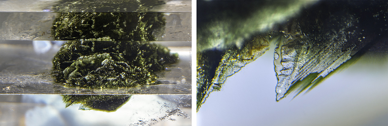 Creative dyeing also produced the manufactured inclusion in a 109 ct quartz with a completely enclosed green moss-like inclusion (figure 5). This stone consists of two pieces of rock crystal quartz, each with a centralized network of fine fractures that may have been artificially induced by laser, judging from their unnatural irregular pattern and striated appearance. The fracture network in each piece was subsequently filled with a dark green resin to give the appearance of a moss-like inclusion. The two halves were then glued together with colorless cement, completely enclosing the green moss-like inclusions in water clear rock crystal quartz. This left a somewhat obvious assembly plane (figure 6, left) when examined with the microscope, as well as trapped gas bubbles in the green resin-filled areas (figure 6, right).