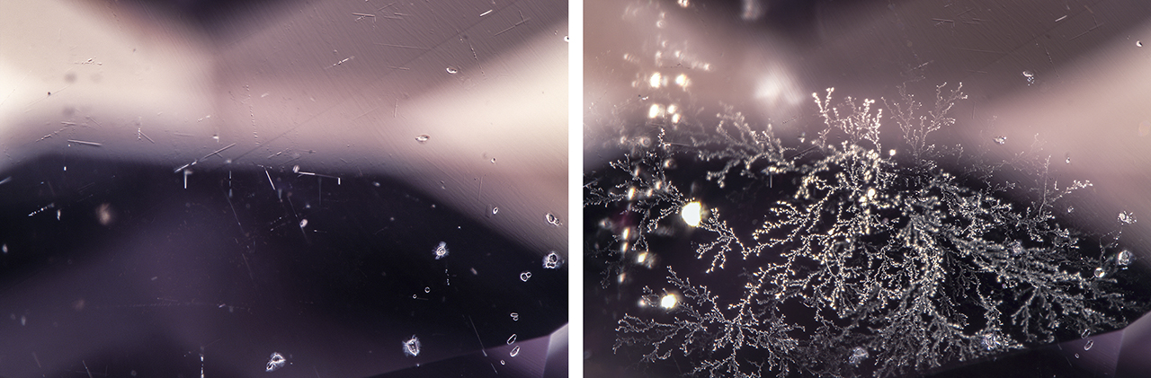 The authors recently examined a 4.03 ct light pinkish purple unheated sapphire. When viewed under darkfield illumination, the inclusion scene at first seemed fairly vacant and occupied only by sparse zircon crystals and rutile needles (see above, left). However, microscopic observation with fiber-optic light revealed large, delicate dendritic inclusions underneath the table (see above, right) that resembled a fern frond. The dendritic inclusions seemed to be flat and parallel to each other and extended the entire length of the table. Small round platelets were associated with the “branches” of the inclusions.
