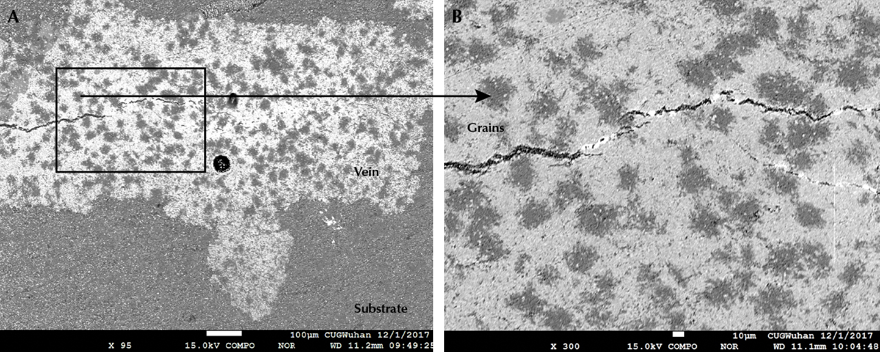Backscattered Electron Imaging. The substrates were dark overall but showed tiny bright grains when examined under high-contrast BSE imaging (figure 7A). However, the raindrops and veins (figure 7B) tended to be brighter than the substrates in specimens B-2 and B-3. There were still numerous small dark grains unevenly distributed in the raindrops and veins (figure 7B), and the gray value of these dark grains was similar to that of the substrates. Meanwhile, some individual or adjacent raindrops were approximately hexagonal in shape, similar to the habit of apatite, under high-contrast BSE imaging (figure 7, C and D). The difference in gray value between the raindrops and the substrates revealed a difference in their mineral phases. The gray values of the raindrops and veins were comparable, indicating a similar chemical composition.