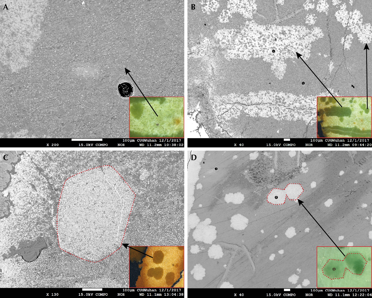 Moreover, numerous small dark grains were distributed in the raindrops and veins under high-contrast BSE imaging (figure 14). According to the EPMA results, their major chemical compositions were Al2O3 (38.25–39.566 wt.%), P2O5 (30.144–31.273 wt.%), CuO (6.464–6.896 wt.%), and FeO (2.051–2.613 wt.%), with minor contents of SiO2, CaO, and F (table 4), corresponding to turquoise.