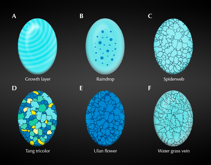 Recently, the authors discovered a particular surface pattern of turquoise (figure 3, A–C) in the Hubei market. Material with this pattern displays blue and blue-green color spots resembling raindrops, occasionally accompanied by veins (figure 3, B and C). This pattern is called “raindrop” turquoise in the trade.