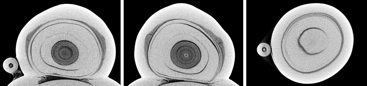 Sample 2-1 revealed a large void that took up nearly half of the pearl’s volume. However, the void is not entirely empty, as a dark gray material can be seen within the virtually black center. This material could be a semi-solid organic-rich phase that is found in many voids in pearls both natural (Homkrajae et al., 2021) and cultured (Otter et al., 2014, Nilpetploy et al., 2018a). However, the organic-rich feature lacks any fine growth structure, which is uncharacteristic of natural pearls. Based on the large void’s absence of any clear growth structure in the organic-rich area, the pearl would be identified as NBC. The hollow slender void present in sample 2-2 is characteristic of voids found in many saltwater NBC pearls. Sample 2-3 showed a central cavity with an inner light gray feature with a radiopacity similar to that of the nacre. This type of void feature has been reported in some NBC pearls from P. margaritifera (Nilpetploy et al., 2018a) and Pinctada fucata (martensii) (Manustrong, 2018). It has also been observed in some saltwater NBC pearls submitted for examination in GIA’s global laboratory locations. Sample 2-4 displayed a combination of dark gray and light gray features inside the elongated void that is sometimes observed in NBC pearls (magnified in figure 9). However, similar alternating dark and light gray patterns have been observed in some natural pearls (Homkrajae et al., 2021), and thus it is possible that some gemologists would identify this pearl as natural. Conversely, some gemologists could interpret the elongated shape and position of the void to be more typical of NBC pearls. This complex divergence reveals the challenges gemologists face in pearl identification, and an inconclusive opinion may well be the result.