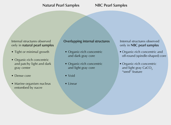 What follows are the identification characteristics observed for the three main structural categories from the known natural and NBC P. maxima pearl samples (figure 14). The first category includes the structures that were only found in natural pearl samples. The structures that fall into this category are (1) tight or minimal growth that lack any clear internal growth features or only showed a few weak growth patterns; (2) an organic-rich concentric structure and patchy light and dark gray center resulting from differences in the organic content within these areas; (3) a dense, solid light gray core not enclosed by any clear organic-rich concentric structure; and (4) a marine organism entombed by nacre deposition. Severely fractured central internal structures were found only in natural pearl samples (Homkrajae et al., 2021; see samples 6-5 and 6-6), yet they appear to be related to later stages of the pearls’ formation and not their initial formation. Therefore, this type of structure may also be observed in NBC pearls and cannot be used as an indicator of a pearl’s identity.