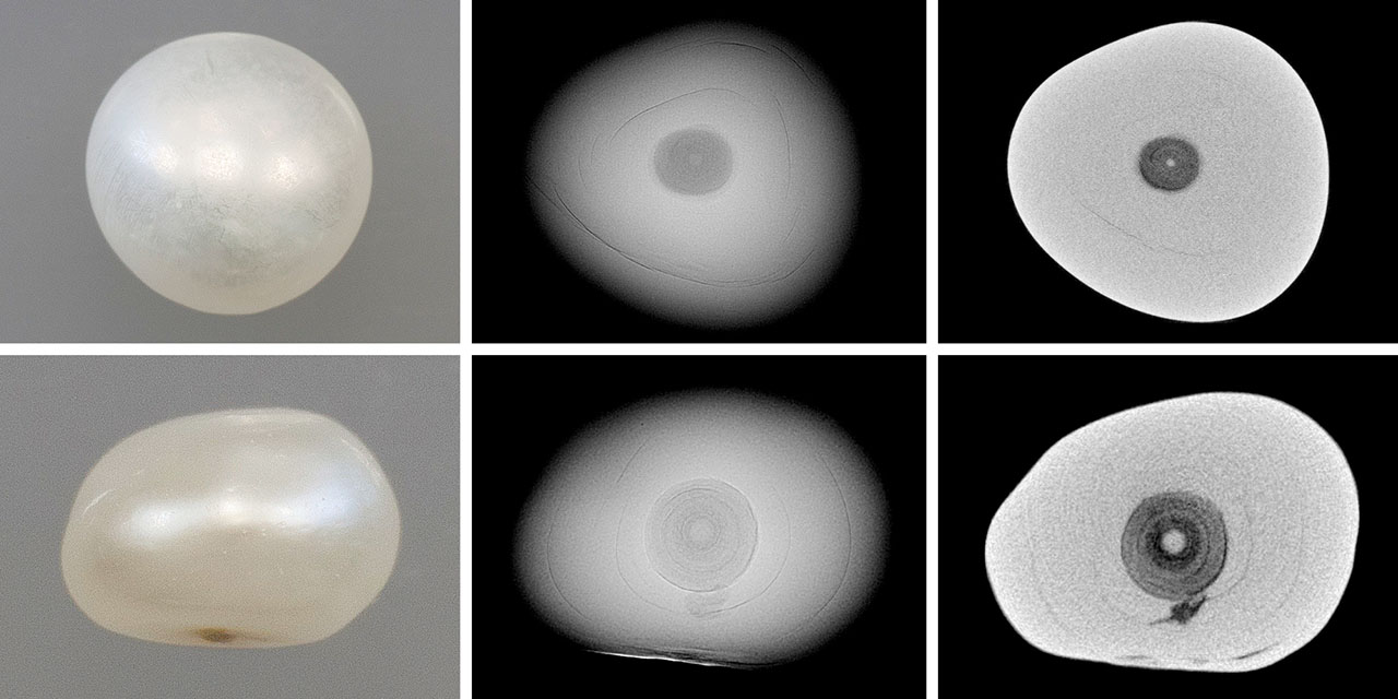 Organic-rich concentric structures, void features, and linear structures are the three main structural types found in the NBC pearl samples studied, and within the additional features found on the BC pearls examined. The majority of the NBC samples exhibited one of two typical internal characteristics—relatively large voids or distinct linear features—helping prove their cultured origin. Other structural features help identify pearls as NBC when observed in conjunction with each other or with the two main NBC structures. These include a large light gray core, an off-round (spindle-shaped) core, and light gray CaCO3 “seed” features found within organic-rich concentric structures. However, as discussed earlier in this study, some particular forms of these three structural types can be observed in some natural pearls, and thus greater care is needed in their interpretation. This illustrates that the distinction between NBC and natural pearls is not always straightforward, and therefore different identification opinions or inconclusive calls may result in certain cases. The results obtained from different analytical methods may also influence the identification results. Factors such as instrument quality and resolution, the operator’s experience, and even the level of care taken during analysis can combine to further hinder identification. In challenging cases, the use of μ-CT is necessary to provide the best possible data for interpreting a pearl’s structure. Lastly, only 86 P. maxima cultured pearl samples were examined in this study. Additional cultured pearl samples are necessary to gain an even greater understanding about the range of possible structures in cultured pearls and to benefit the identification process. The continued study of the internal structures of known cultured pearls provides dependable results that enhances GIA’s reference collection database and can provide clients with greater peace of mind.