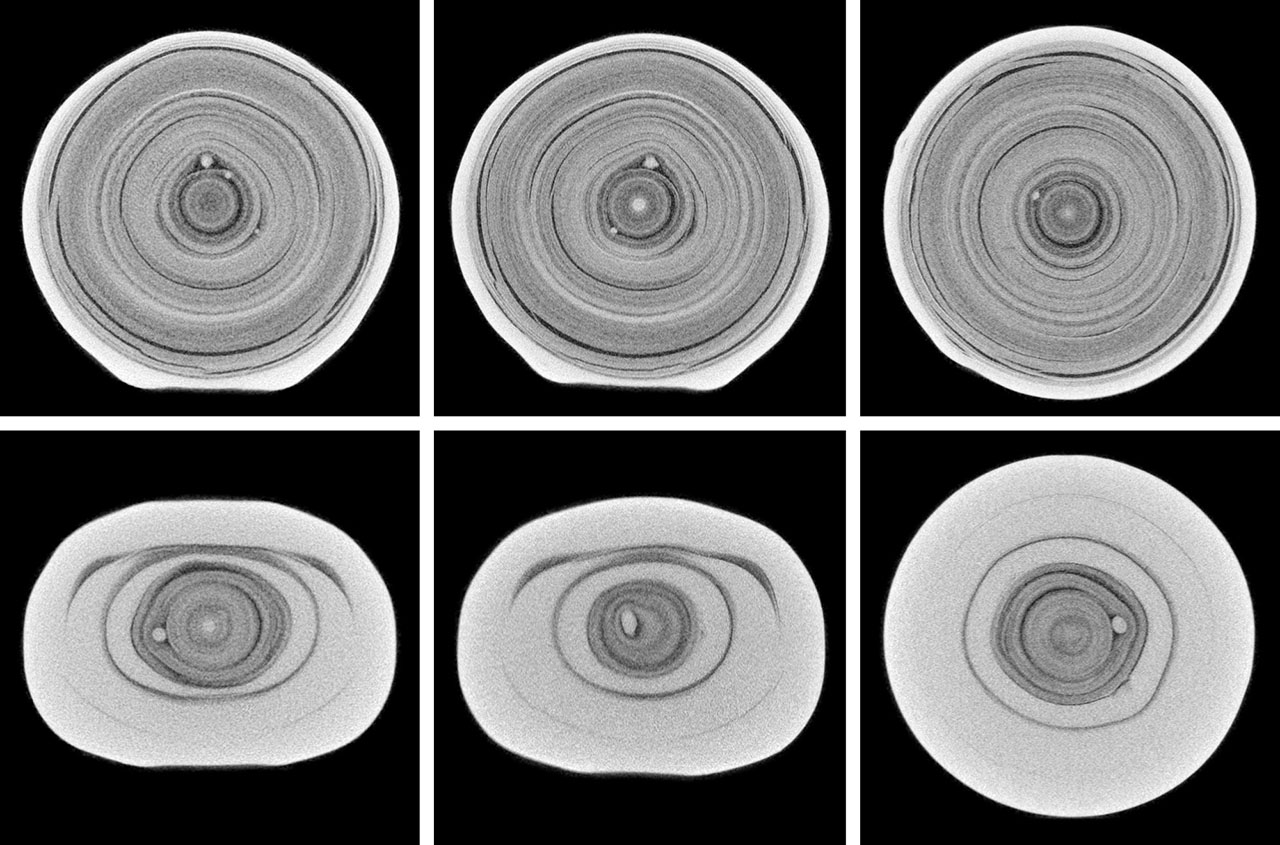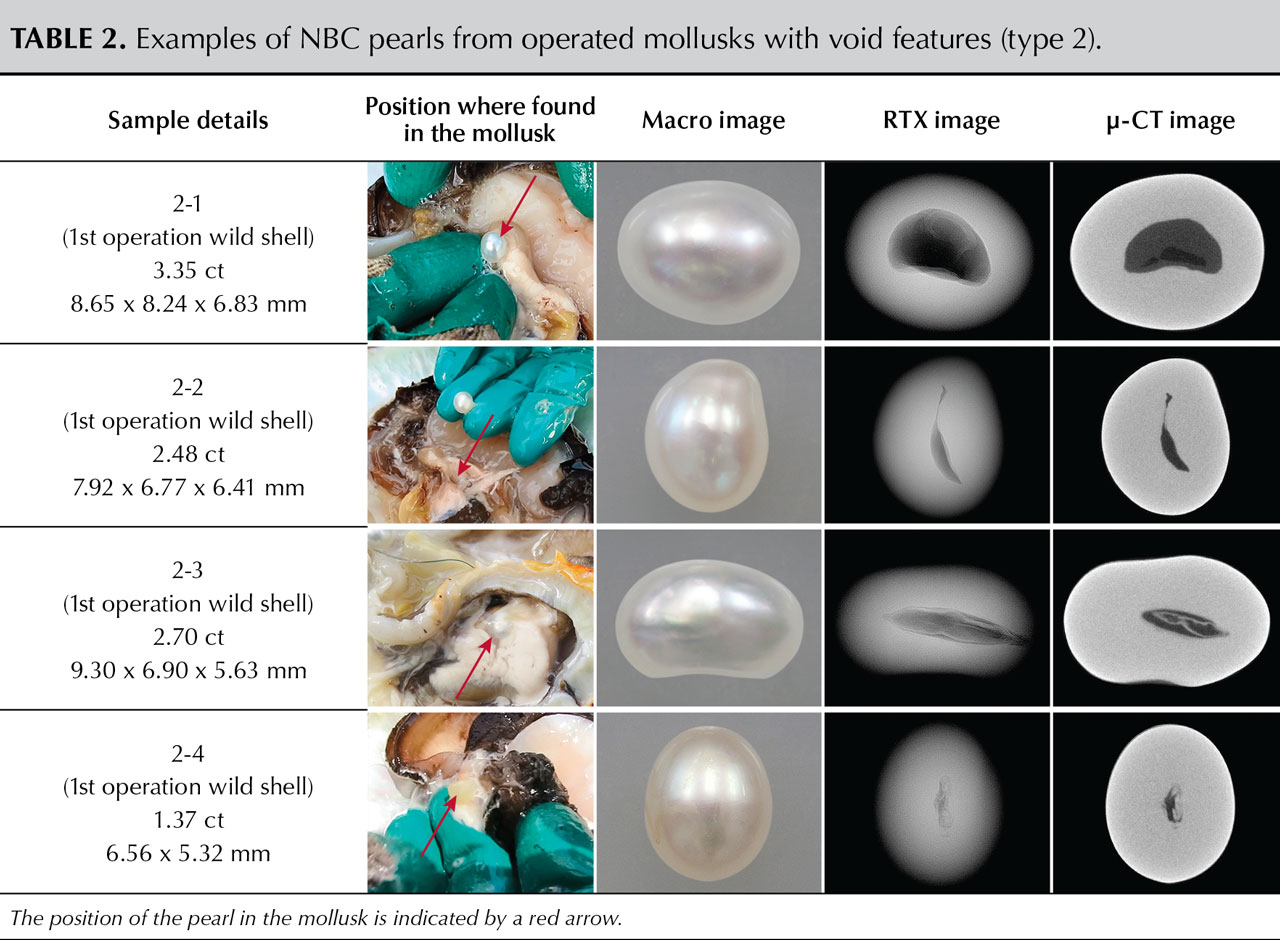Type 2: Void Features. Void and linear features are internal cavities or areas filled with gas and/or liquid phases, which are more transparent to X-rays (radiolucent) and appear on RTX and μ-CT images as various tones of gray, usually dark, depending on size and volume. Because voids generally occupy a greater area than linear features (thin or slender voids) and therefore look different, they have been separated into different structural types in this article. Voids are often seen in saltwater NBC pearls, and gemologists use them to separate NBC from natural pearls. While P. maxima mollusks produce the majority of NBC pearls seen in the market, other Pinctada species also produce them (Wehrmeister et al., 2008; Sturman, 2009; Krzemnicki et al., 2010; Sturman et al., 2016, 2017; Nilpetploy et al., 2018a; Manustrong, 2018; Al-Alawi et al., 2020). Thus, it was unexpected that only 10 of the 74 NBC pearls in this study displayed void features. Four were selected to show the various types of voids encountered (table 2). Most of the voids observed in this study were elongated (i.e., ellipse and ovoid cavities filled with gas and/or liquid phases) and oriented along the longest direction of the pearl. The light gray, representing the overlying nacre around the voids, was generally tight or only contained a few growth lines comparable with most NBC pearls in the type 1 group. Although only single voids were observed in samples from this study, double or multiple voids are sometimes observed in NBC pearls (Sturman et al., 2016).