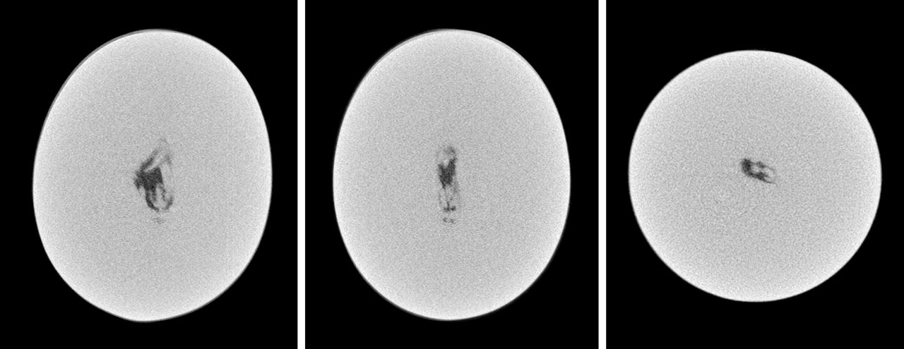 The linear structures visible in samples 3-5 through 3-10 are more complex, and some are seldom encountered in NBC pearls. Therefore, the identification of some NBC pearls is not straightforward. Sample 3-5 revealed a pear-shaped dark gray, organic-rich structure with an unclear associated darker feature in the RTX image that appears more likely to be a natural pearl structure. However, the dark feature shows up more clearly (magnified in figure 10) when analyzed by a high-resolution μ-CT unit, and it appears to be more linear and thus possibly more characteristic of some NBC pearls. Yet this feature does not correspond with the majority of linear associated structures observed in NBC and natural pearls, and therefore an inconclusive opinion may result. However, some gemologists may consider the linear feature sufficient evidence to identify this pearl as NBC, which would be consistent with its recorded provenance.