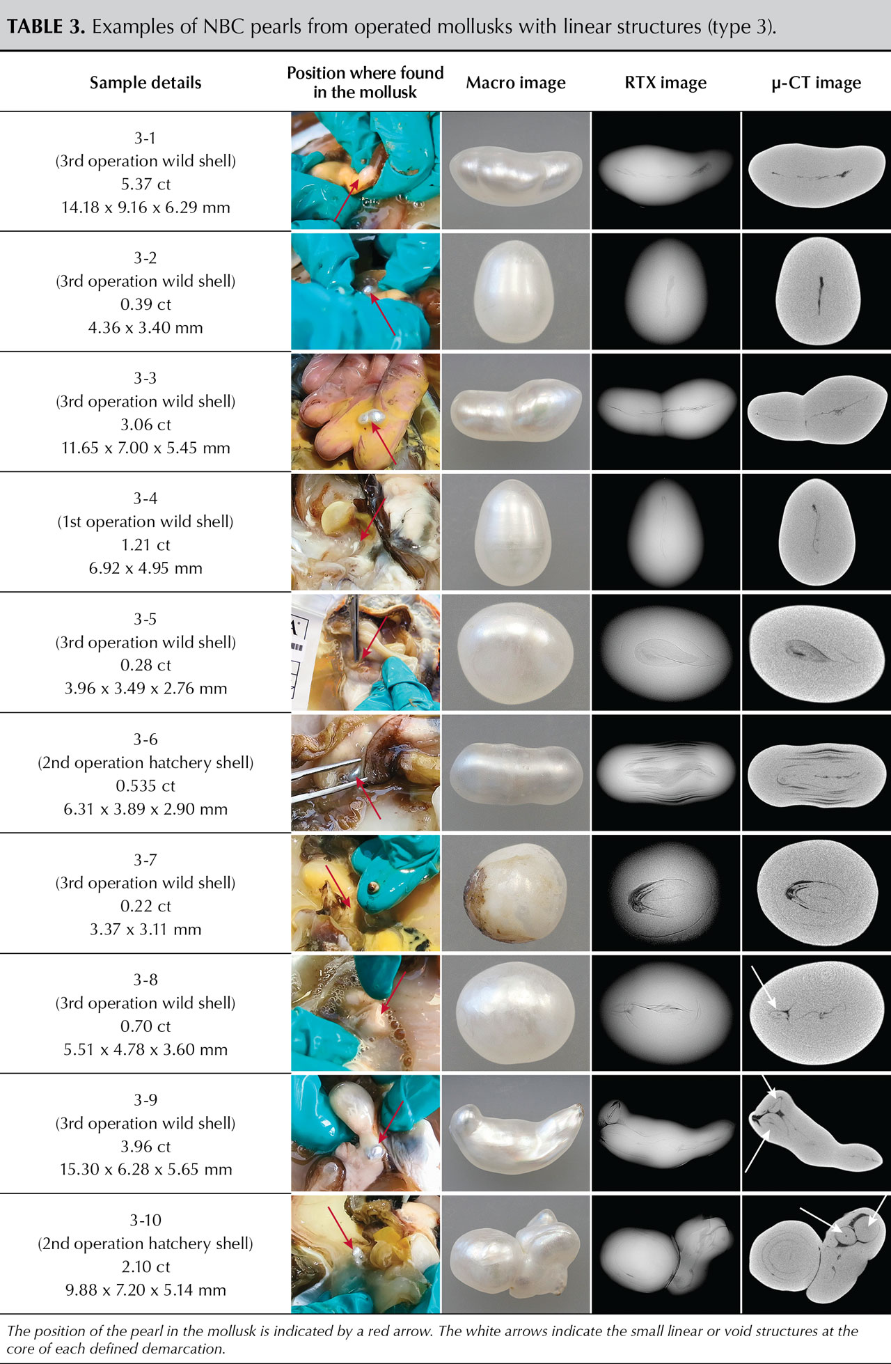 Type 3: Linear Structures. Linear structures are the most common type encountered in NBC pearls produced by various mollusks originating from saltwater and freshwater environments (Scarratt et al., 2000; Hänni, 2006; Sturman, 2009; Krzemnicki et al., 2010; Sturman et al., 2016, 2017; Nilpetploy et al., 2018a; Manustrong, 2018; Al-Alawi et al., 2020; Kessrapong and Lawanwong, 2020). Not surprisingly, almost half of the NBC samples showed linear features, and 10 samples with various forms of these are presented in table 3. Samples 3-1 through 3-4 showed classic linear structures typically observed in NBC pearls. The extended linear feature displayed is the dominant structure seen running the length of each pearl. Even though samples 3-1 and 3-2 look different externally, they were harvested from the gonad of the same mollusk and share similar linear structures.