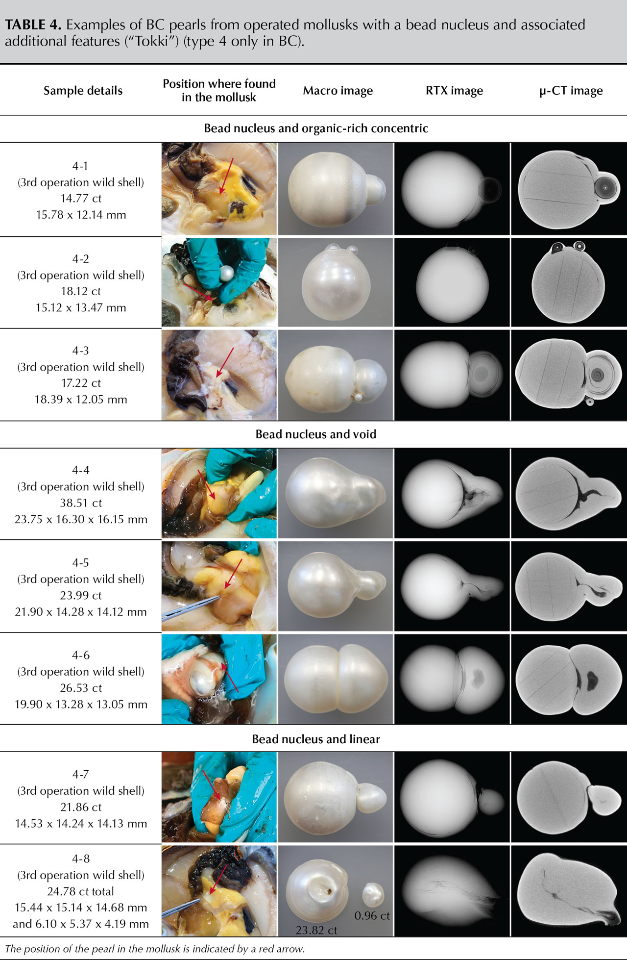 Type 4: Bead Nucleus and Associated Additional Features. Twelve BC pearls with potentially intriguing additional features were selected from the many BC pearls recovered during the harvest. These additional features displayed organic-rich concentric, void, and linear features similar to the structures typically encountered in NBC samples; eight representative samples are shown in table 4. The additional features directly affected the pearls’ external appearance, often resulting in baroque shapes. Although the pearls possessed additional features, their main body contained a bead nucleus and thus they would be classified as BC pearls. These extra features can form next to the bead nucleus (samples 4-1, 4-4, and 4-5) or independently from the bead nucleus and still be firmly attached to the outer nacreous layers (samples 4-2, 4-3, and 4-6). They may also form independently from the BC pearl and be loosely attached to the surface, where they are likely to separate later and become individual NBC pearls (samples 4-7 and 4-8).