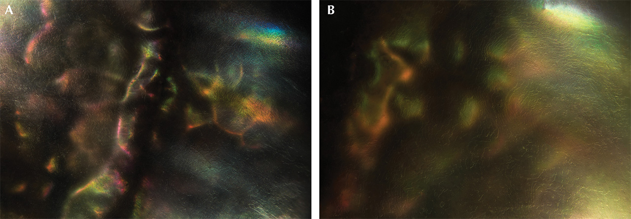 The light gray bodycolor of the pearl was caused by large voids or gaps surrounding its bead nucleus, which could be seen using real-time X-ray microradiography (RTX). Akoya pearls possess very thin nacre platelets that are transparent to translucent when viewed under strong lighting, allowing the viewer to see into the deeper layers of the pearl. The strong iridescence was caused by light interference within alternating layers of aragonite and conchiolin—the two substances that create nacreous pearls and that also have different refractive indices. Specifically, this iridescence is caused when incoming overhead light is reflected from the surfaces between the successive aragonite and conchiolin layers. When the reflected light rays from a bottom layer of nacre interfere with the incoming light, iridescence is created. In pearls, this feature is known as orient (E. Fritsch and G.R. Rossman, “An update on color in gems. Part 3: Colors caused by band gaps and physical phenomena,” Summer 1988 G&G, pp. 81–102). The underlying botryoidal structure combined with the iridescence from the overlying nacre was responsible for the unusual pattern or orient seen in this akoya pearl. This is the first time the author has encountered such a phenomenon in a pearl.