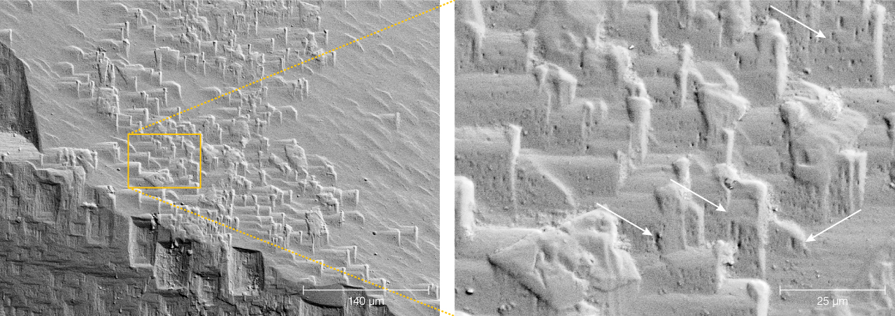 A characteristic feature of Volyn beryl crystals is their morphology, with exceptionally large dissolution features (etch pits), described on the basis of light microscopy by Bartoshinskiy et al. (1969) and Lazarenko et al. (1973). The prism faces show rectangular cavities with negative crystal faces, while the basal planes show negative, hexagonally shaped crystal faces. Although dissolution of early precipitated minerals during a later stage is frequently observed in pegmatites (Černý, 2002; London, 2008), these features together with the yellow-green color and their size are diagnostic for Volyn beryl. In large crystals, they are visible without magnification, and in smaller crystals they can be seen with the aid of a loupe or optical microscope.