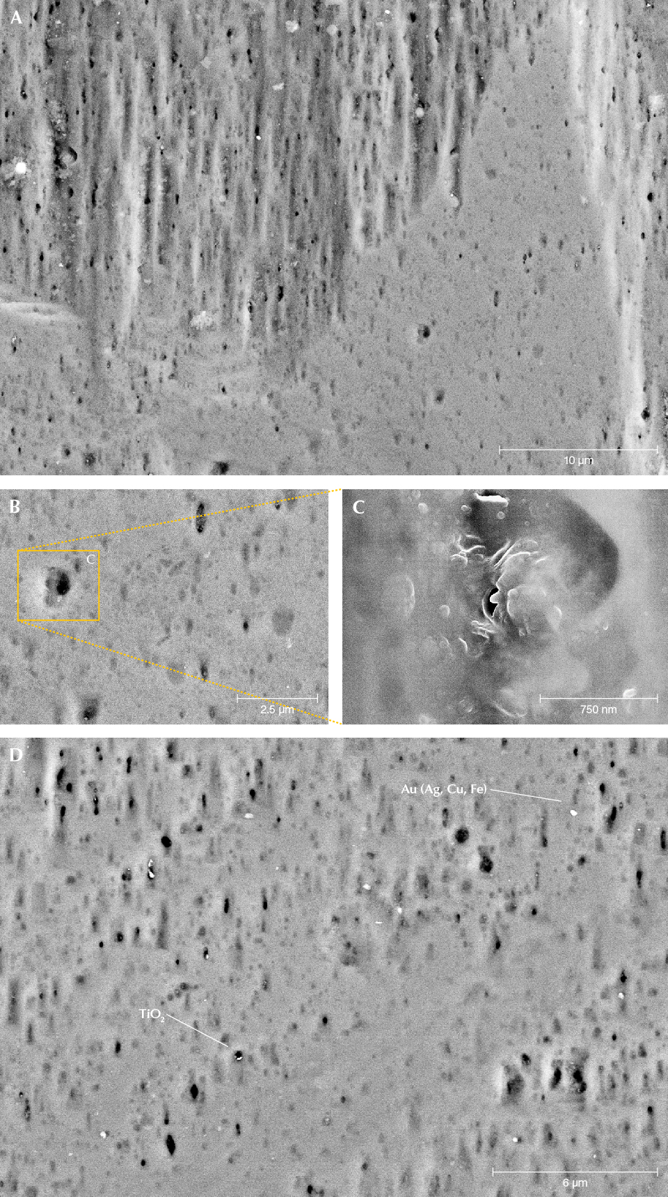 Analysis of the crystals’ surfaces yielded more information about the dissolution process and the components in the dissolving fluid. The faces show a porosity, both outside and inside the etch pits (figure 12) and also within the small C-type etch pits. Individual pores show no crystallographic outline and are on the order of several hundred nanometers, mostly elongated parallel to the c-axis. Very small grains of a titanium dioxide polymorph and gold (with minor contents of silver, copper, and iron as determined by EDS) were observed (figure 12D), as well as particles consisting of a mixture of chloride and sulfate crystals and a particle with light rare earth elements and phosphorous.