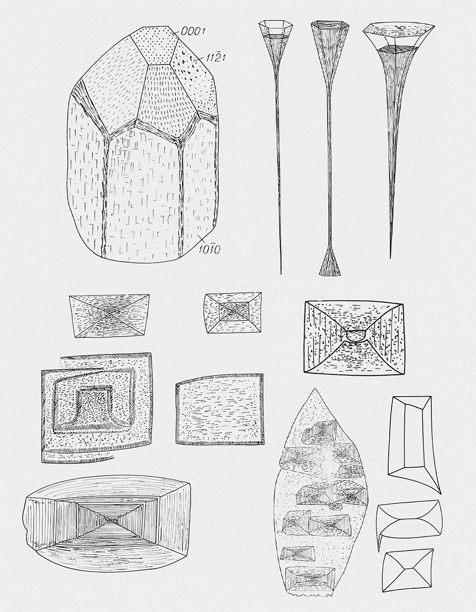 Lazarenko et al. (1973) described different stages of the dissolution of beryl, which produced five morphological types of columnar-prismatic, occasionally spicular beryl crystals (table 1), with characteristically sculptured crystal faces as well as systems of dissolution cones (so-called etch channels). Basal faces are rare. Bartoshinskiy et al. (1969) showed rectangular F- and P-type etch pits with a partly curved outline on the first-order prismatic face and spectacular long, tubular etch pits on the pinacoidal face (figure 5).