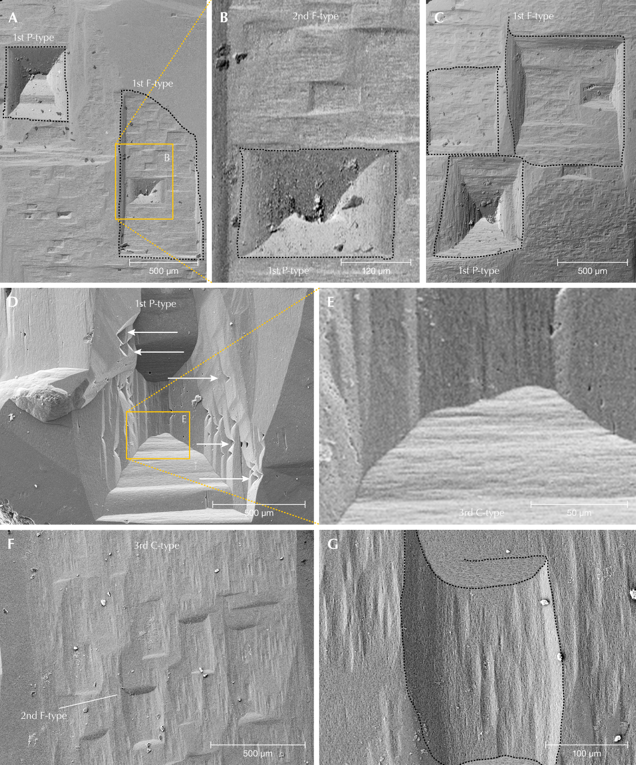 Figure 9 shows etch pits on the first-order prism {1010} of the beryl crystals. These etch pits are rectangular, with their long side parallel to the c-axis (figure 9A), perpendicular (figure 9B), or nearly square (figure 9C). Similar to {0001}, F-type etch pits were observed in three orders of magnitude; however, P-types are much rarer and only observed in first-order, whereas F-types dominate and there is a more or less continuous spectrum for second- and third-order types. In addition, there are small C-type etch pits, which can be oriented perpendicular to the c-axis (figure 9, D and E) or parallel to the c-axis (figure 9, F and G). First-order P-types with stepped sides can be strongly elongated parallel to the c-axis (figure 9, D and E). F-type etch pits show a smooth curvature of the edges (figure 9G), which was also observed in P-types (figure 9B).