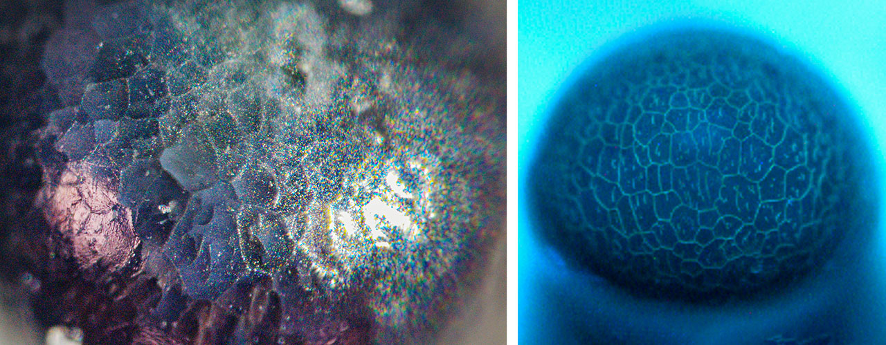 The pearl had a glossy appearance with a few pits and no surface-reaching cracks. Viewed under high magnification with a fiber-optic light, it showed a non-nacreous surface, presenting cellular outlines with fine small lines within each cell (figure 2, left). When exposed to X-ray fluorescence, the pearl showed an inert reaction. Energy-dispersive X-ray fluorescence spectrometry revealed a manganese level of 76 ppm and a higher strontium level of 1160 ppm, indicative of a saltwater origin. Under long-wave and short-wave ultraviolet radiation, the pearl showed an inert reaction. However, DiamondView imaging revealed a remarkable cellular structure within. A bluish reaction was observed at the boundaries outlining the cellular columnar structures with thin, short lines within the cells (figure 2, right). This cellular surface structure appeared different from the pseudohexagonal cellular outline found in pen pearls (N. Sturman et al., “Observations on pearls reportedly from the Pinnidae family (pen pearls),” Fall 2014 G&G, pp. 202–215). Based on the authors’ previous observations, this type of structure is more typically found on the surface of non-nacreous pearls from the Pinctada radiata mollusk.
