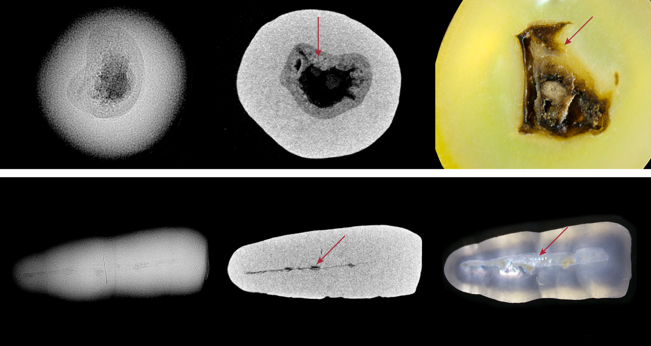 To further study these challenging internal structures, two pearls were ground down. The dark gray void-like area seen in the RTX image of pearl A was composed of a solid organic material that appeared as a light and dark brown area in the cross section (figure 3, top row). Pearl B, which showed an elongated linear structure in the RTX image, had a hollow space with organic-rich pockets (figure 3, bottom row).