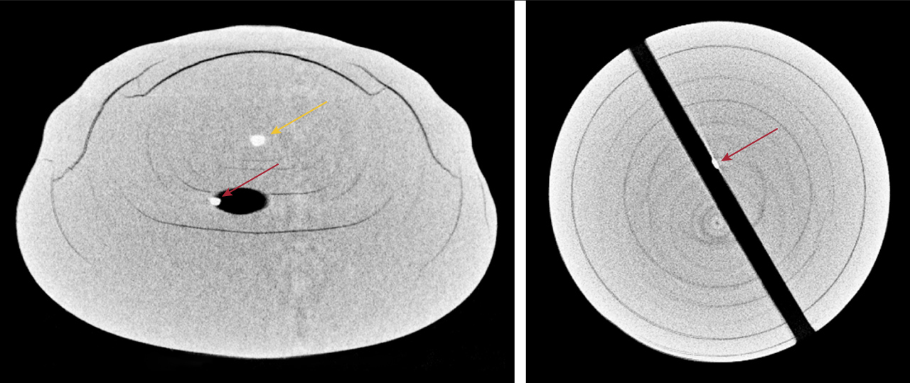 Upon closer examination using X-ray computed microtomography (μ-CT), the metal feature within the drill-hole area appeared similar to the metallic core found within the pearl and seemed to be partially embedded within the pearl’s growth arcs. Both metal features exhibited undulating outlines and a lack of sharp edges typically associated with a broken metal fragment. Given the similar properties of both metal features, the metal feature at the drill hole may have been present prior to the drilling process, rather than a remnant from a drilling needle (figure 3).