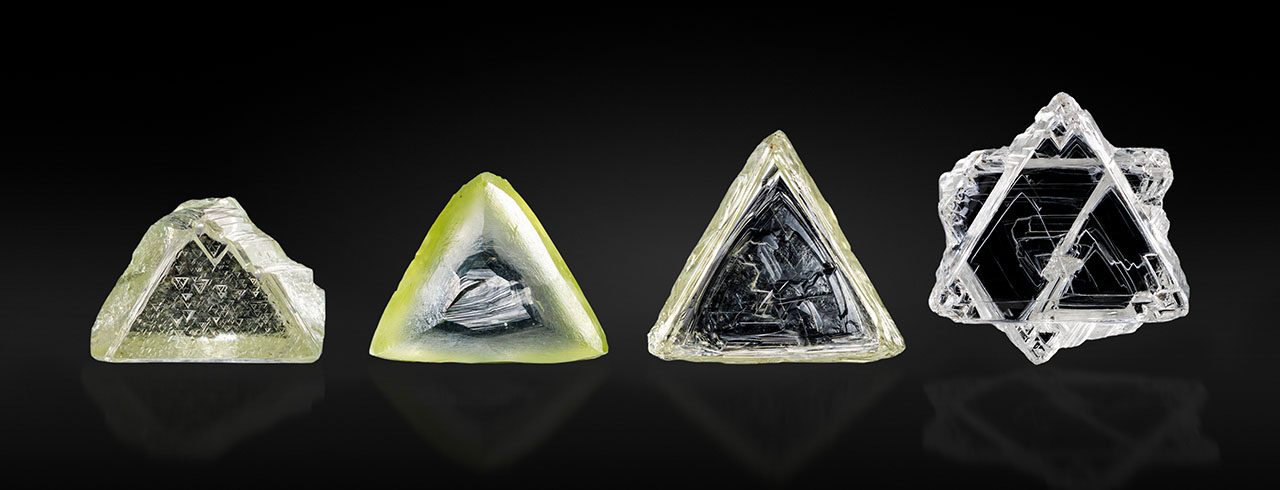 The most distinctive type of contact-twinned crystals are the triangular macle (French for “twin”) diamonds (figure 1). These diamonds consist of two octahedral crystals in contact with each other on the (111) octahedral face, with the twin plane parallel to the octahedral <111> direction. These crystals often grow significantly larger than the sum of the two single octahedral diamond crystals would be, displaying the characteristic morphology of a flattened triangular shape (Sinkankas, 1964; Orlov, 1977; Tappert and Tappert, 2011). Due to dissolution, macle diamonds may also lose their sharp edges and develop a rounded habit. In some South African diamond mines, an average of 10–15% of diamonds are macle crystals (Harris et al., 1975). Twinning also occurs in synthetic diamonds grown by chemical vapor deposition (CVD), with the contact twin mechanism originating from the formation of a hydrogen-terminated four-carbon atom cluster on the {111} surface during polycrystalline diamond growth (Battaile et al., 1998; Butler and Oleynik, 2008).