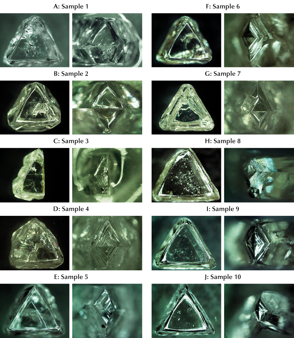 Samples. Fourteen selected rough macle diamonds from South Africa (samples 1–14) were used in this study. The crystals ranged in weight from 0.118 to 0.747 ct, with one side length varying from 2.4 to 6.3 mm and colors spanning from colorless to light yellow and very light pink. Samples 1–10 were provided by the Department of Geology and Mineralogy at Kyoto University. Samples 11–14 were loaned by Suwa & Son, Inc. and were used only to study the external morphology.