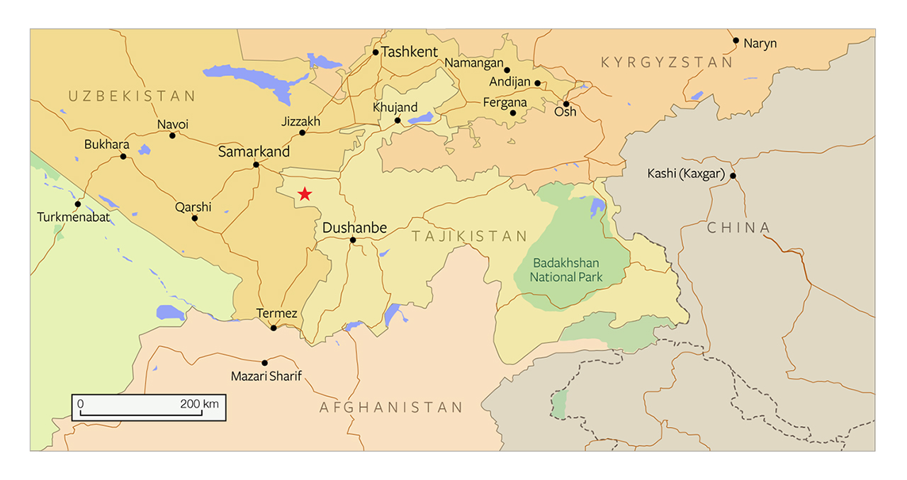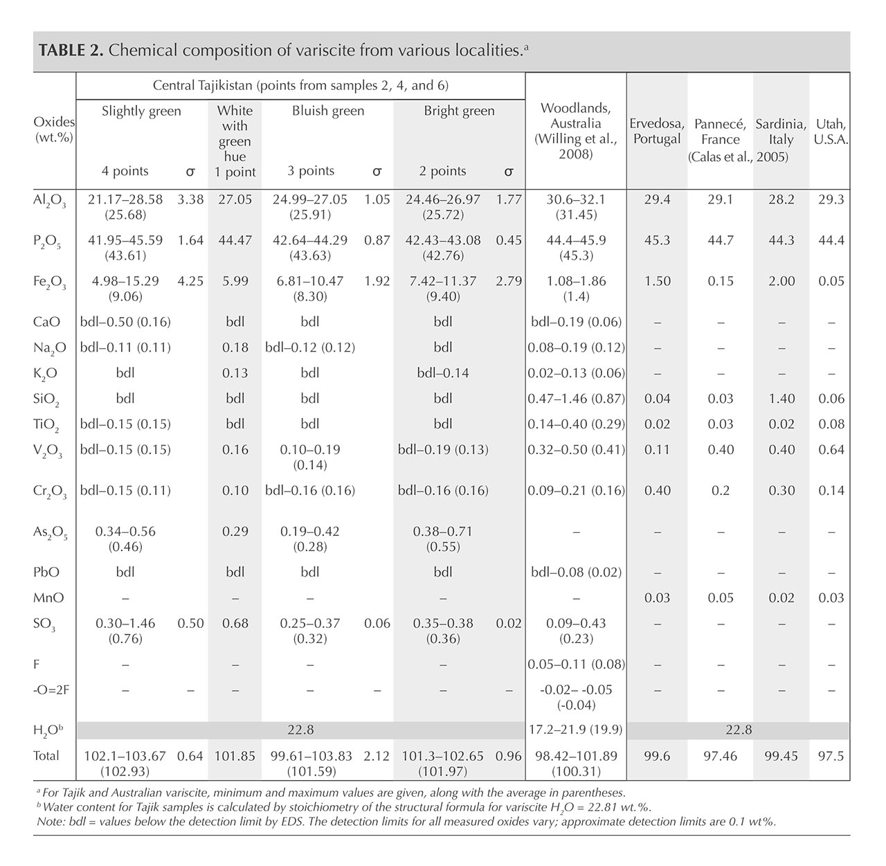 In 1979, variscite-bearing veins were found by one of the authors (AKL) in the headwaters of the Shing River, southwest of Marguzor Lake (39°09΄ N, 67°50΄ E; figure 2) in central Tajikistan. The occurrence is situated within the jaspers of the Akbasayskaya suite in the Shing-Magian antimony-mercury ore district, 1 km east of the Chorroha antimony deposits (currently not in operation). The region forms the western part of the Zeravshan-Hissar structural-formational zone, which belongs to the Southern Tien Shan part of the Ural-Mongolian belt in the Hercynian mountain-folding region (Baratov, 1976). The collected samples, like those shown in figure 1, were visually identified at the mining site as chrysoprase, but X-ray powder diffraction (XRD) later determined that the material consists mainly of variscite and strengite, along with minor amounts of scorodite, metavariscite, phosphosiderite, jarosite, and quartz (Litvinenko et al., 2013). No mining activities have taken place in the area.