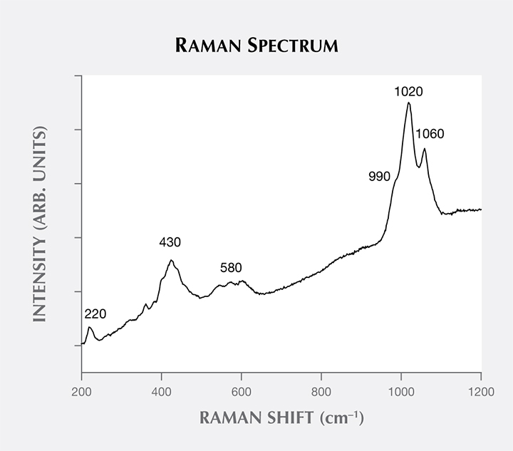 Figure 4 presents a Raman spectrum of one sample, studied previously by XRD (see Litvinenko et al., 2013). The most intense apparent maxima is at approximately 1020 cm–1, with two less intense peaks at around 990 and 1060 cm–1, all due to PO4 symmetric stretching vibrations of the minerals from the variscite and metavariscite groups (Frost et al., 2004; Onac et al., 2004). The most intense bands are due to variscite-stretching vibrations, but their exact position and shape are likely due to the presence of other minerals of the variscite and metavariscite groups, such as strengite and phosphosiderite. A series of less intense bands, the result of PO4 bending modes, are observed at about 580, 430, and 220 cm–1 (again, see Frost et al., 2004; Onac et al., 2004). Higher luminescence is observed in the green portion of the spectrum (figure 4). Quartz was also occasionally identified.