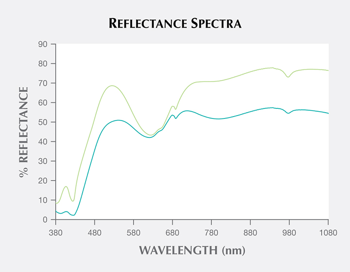 Figure 5 presents reflectance spectra of the green and bluish green areas from 380 to 1080 nm. The strong decrease in reflectance at around 425 nm is probably related to Fe3+; the large weak band above 750 nm is likely due to vanadyl groups rather than Fe2+ (Calas et al., 2005). The decrease in reflectance centered at around 630 nm (and an associated, barely visible decrease in the blue part around 445 nm), as well as the additional weak sharp reflectance decreases at about 645 and 690 nm, are assigned to spin-forbidden transitions of Cr3+ (Calas et al., 2005). A gradual decrease of reflectance from the near-infrared through the visible region is also observed in both spectra, though it is more pronounced in the bluish green samples. The relative intensity of the iron- and chromium-related bands is higher on the bluish green part than on the green (again, see figure 5). The sharp band at around 975 nm in the near-infrared region is related to overtone vibrations of OH in the structural water (again, see Calas et al., 2005).