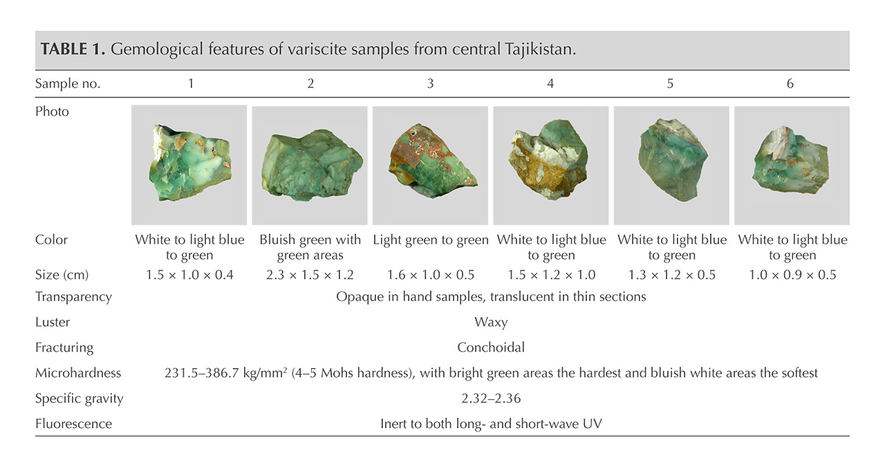 In this article, the gemological properties of variscite samples from central Tajikistan are presented along with spectroscopic and chemical data. The results obtained are also compared with the existing data found in the literature on variscite samples from other occurrences.