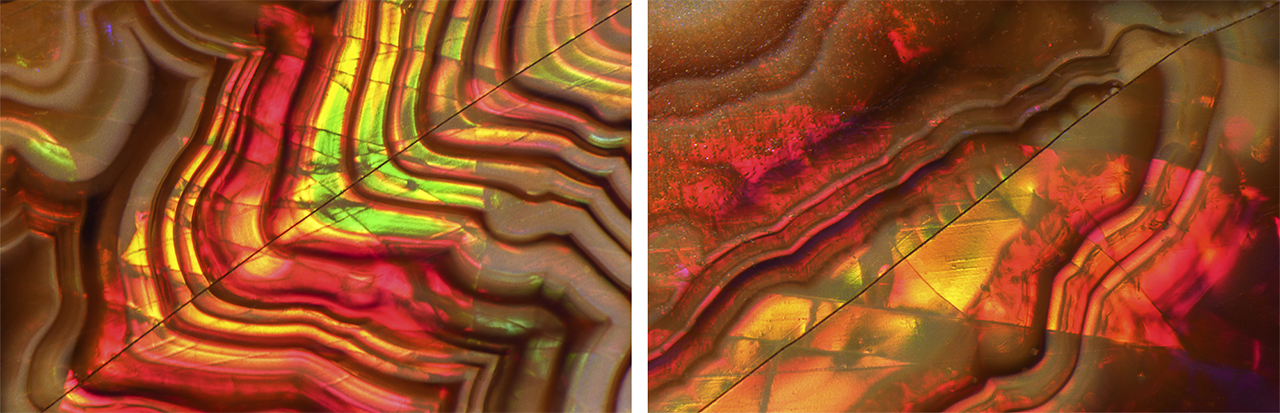 Careful microscopic observation yielded some interesting conclusions. A few small healed cracks in this stone were naturally repaired with opal infilling. Some of these cracks showed a lateral offset as they cut across the banding (figure 3, left). We also observed that the fractures that showed an offset in the banding showed no offset in the “photonic crystal” (B. Rondeau et al., “On the origin of digit patterns in gem opal” Fall 2013 G&G, pp. 138–146), or in the single play-of-color patches (figure 3, right). These observations are important in revealing the order of events that took place to produce such a specimen. First, the deposition of chalcedony had to occur in order to produce the crenulated (wavy) banded pattern. Second, stress cracks were introduced into the agate and then laterally shifted, creating several “micro-faults.” These micro-faults were subsequently “healed” with a secondary deposit of opal. This secondary opal deposition also replaced the chalcedony while preserving the original agate-like banding, which was apparent since there was no offset along the micro-faults in the patches of play-of-color.