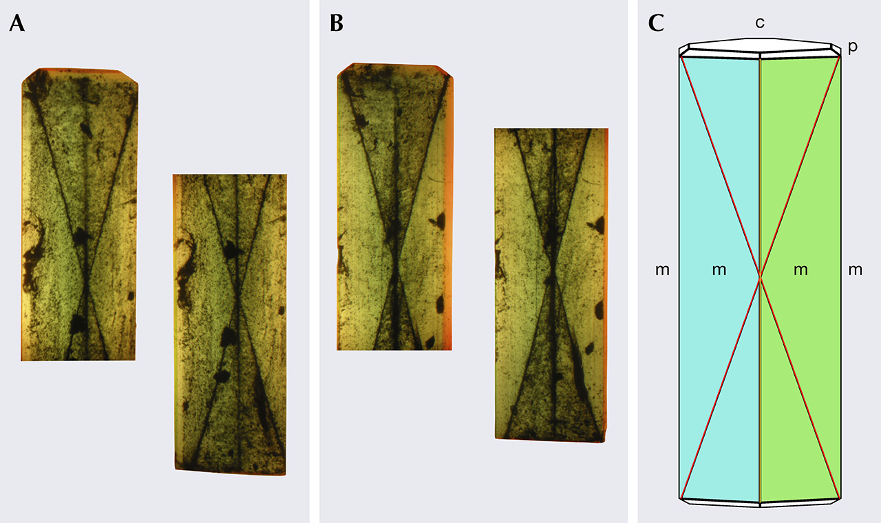 It is evident that the various lines forming crosses in the form of an X are the traces of plane boundaries between the two pinacoidal and the six prismatic growth sectors. The vertical lines that subdivide these crosses in the second orientation described here represent boundaries between the six prismatic growth sectors (see figures 1B, 2C, and 4A). The cone-shaped outline of each pinacoidal growth sector is formed by boundaries between the tapered core and six prismatic growth sectors (figure 4B). The different patterns depend only upon the orientation of the crystal in the direction of view and the orientation of the various boundaries between the six prismatic and two basal growth sectors within the emerald.