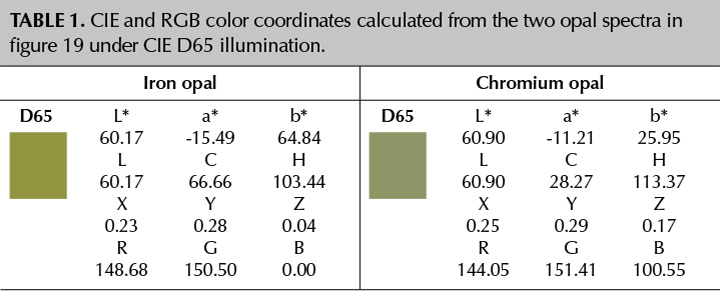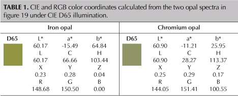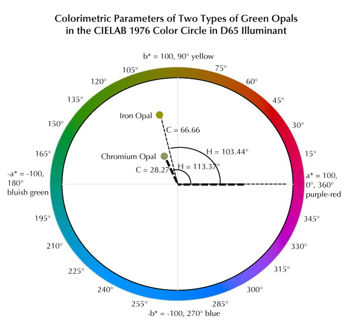 The two color panels calculated from the two spectra were also plotted in the CIE L*a*b* 1976 color circle seen in figure 4. This allows for a more accurate comparison between the two color panels using quantitative colorimetric data. In the plot, the hue angle of the iron opal is smaller than chromium opal, resulting in a more yellowish green hue. The chroma of the iron opal is larger than that of a chromium opal with similar lightness, resulting in a more saturated color.