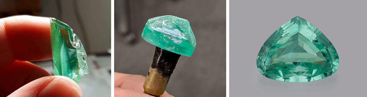 The strongly saturated bluish green hue of a 17.52 ct phosphophyllite echoed that of some of the finest hues of Paraíba tourmalines, though the stone is very different both structurally and chemically. Phosphophyllite was named in 1920 as a homage to its phosphate composition and perfect leaf-like cleavage (from the Greek phyllon, meaning “leaf”). Ann Barker of Barker & Co. explained that this particular phosphophyllite has a significant provenance. Once owned by author and renowned mineral collector Dr. Peter Bancroft, it was mined in the famed Potosí mine of Bolivia in 1958. Many years later, prize-winning gem cutter Stacy Whetstone took the striking 45.42 ct rough and expertly faceted the material into the finished 17.52 ct rounded trillion (figure 2). Given phosphophyllite’s considerable heat sensitivity, the gem took four weeks to cut and finish.