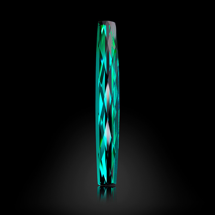 His exquisite attention to detail and understanding of color and light enable Avery to cut award-winning, one-of-a-kind faceted gemstones. The majority of his pieces require designers to create custom settings. He has relationships with several skillful designers who allow him to share his vision for the piece and then take it from there. His talent, in combination with the talent of these designers, has earned him many “Best Of” titles in the AGTA Spectrum Awards. Avery cut a matching pair of Afghanistan indicolite tourmalines that were 2018 AGTA Cutting Edge Awards first-place winners in Pairs and Suites. The following year, those same tourmalines won yet again in the Spectrum Awards, in earrings designed by Adam Neeley (figure 4).