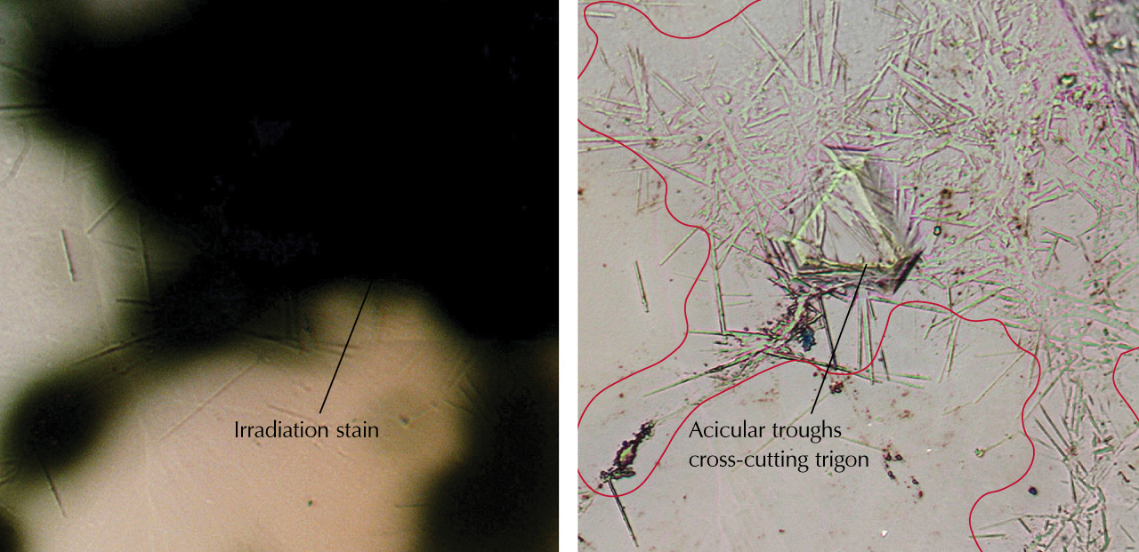 The author acquired an alluvial rough diamond from Guyana showing unique surficial features that do not appear to have been documented elsewhere. The specimen was a twinned crystal consisting of two intergrown octahedral crystals, ~0.12 ct in weight, with numerous flat-bottomed hexagonal etch features and trigons and a nearly pervasive green skin (figure 1). Most interesting were fine, linear, and randomly oriented features on the diamond surface that were spatially associated with the green stains (figure 2). Radiation stains are known to cause localized expansion in diamond (L. Nasdala et al., “Radio-coloration of diamond: A spectroscopic study,” Contributions to Mineralogy and Petrology, Vol. 165, 2013, pp. 843–861; S.C. Eaton-Magaña and K.S. Moe, “Temperature effects on radiation stains in natural diamonds,” Diamond and Related Materials, Vol. 64, 2016, pp. 130–142). These features also cross-cut trigons, implying that they post-date the diamond’s growth in the earth’s mantle and its surface dissolution within the kimberlite magma (figure 3). These features may be the result of localized dissolution caused by proximal acicular, radioactive, and as yet unknown minerals, leaving behind a cast impression. Green color in diamond can be produced by natural irradiation of the crystal lattice by exposure to radiation from proximal and adjacent radioactive grains (e.g., zircon, monzonite, uraninite, and K-feldspar) or salts dissolved in percolating fluids surrounding the diamond (C.M. Breeding et al., “Natural-color green diamonds: A beautiful conundrum,” Spring 2018 G&G, pp. 2–27). Gamma, alpha, or beta radiation emanating from these sources are thought to cause collections of defects and impurities within the diamond. Gamma and beta radiation have low energies and long penetration depths producing green bodycolors. Due to its high energy, alpha radiation has the shortest penetration depth and only within the first 25 μm of the diamond surface, creating green skins, stains, and spots.