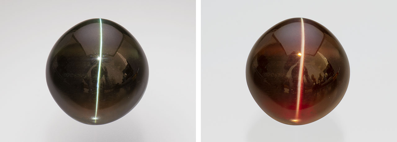 Stefan said they had received a 35.05 ct cat’s-eye alexandrite (figure 2) that morning. He noted the size, exceptionally sharp eye, and superb color change for Sri Lankan alexandrite, which typically has a weaker color change than material from Russia and Brazil. Alexander pointed out that cat’s-eyes are less common in alexandrite than in other chrysoberyl. “A cat’s-eye alexandrite with a strong color change like this one is extraordinary,” he said. “A size of 35 carats is what makes it outstanding.”