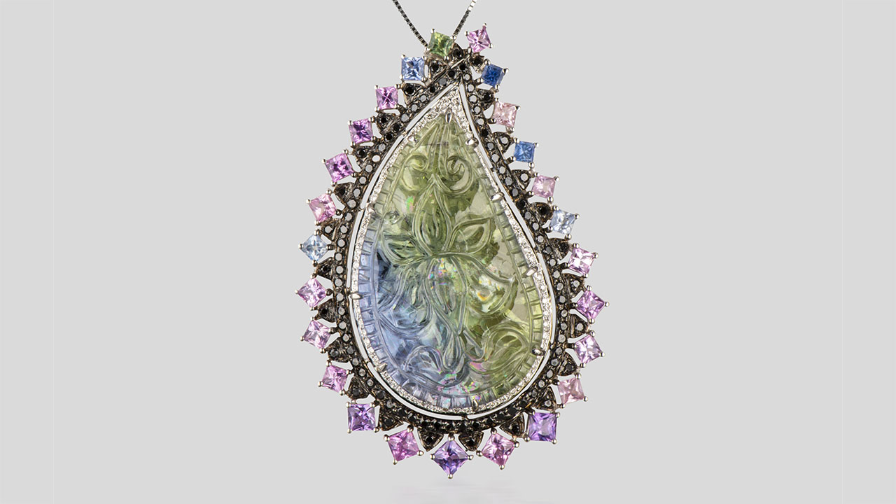 A dazzling pair of carved tanzanite earrings (figure 1) caught our attention at the GJX show. Designer Surbhi Pandya of YNY Jewels (New York), who goes by the single name Surbhi, described the significance of the carving featured on each of the large unheated tanzanite crystals. Depicted in violet and green is the lotus blossom, a flower with ancient cultural significance in India, rising with its deep roots from the mud without stains, symbolizing purity and strength. As the blossoms close up at night and reopen the next day, they also symbolize rebirth. Each carving is immediately surrounded by a ring of blue Kashmir sapphires and emeralds, followed by colorless diamonds and bright green tsavorite garnets. Each upper dangle contains faceted slices of tanzanite and emerald with a central hot pink sapphire. She also shared a pendant with a paisley-shaped unheated tanzanite similarly containing a lotus carving (figure 2). She explained that the paisley shape represents continuity and life.