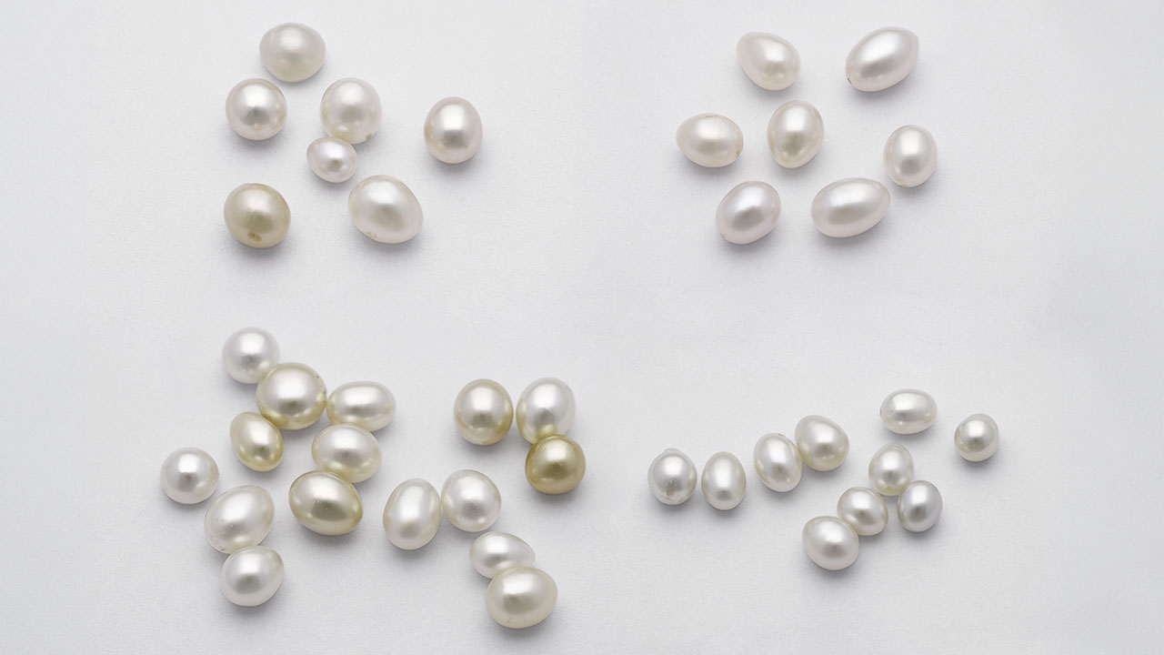 To further examine challenging structures, GIA’s Mumbai laboratory borrowed pearls represented as natural from a known source. The lot consisted of 40 white to light cream drop and oval pearls (28 undrilled, 7 drilled, and 5 partially drilled). The smallest weighed 0.62 ct and measured 5.17 × 4.16 mm, and the largest weighed 2.95 ct and measured 9.53 × 6.65 mm (see above). The pearls all looked new, with smooth, high-luster surfaces that were free of blemishes. Under 40× magnification, the surfaces showed well-defined overlapping fine aragonite platy structures that accounted for their silky surface sheen.