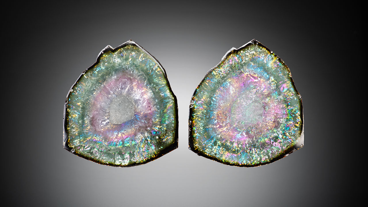 The watermelon tourmaline slices shown in the figure above are remarkable for their mesmerizing iris effect. Unearthed from the famed Cruzeiro mine in the Brazilian state of Minas Gerais more than seven years ago, they were precisely cut to unveil their rainbow spectrum. Each slice, measuring 18 × 18 × 4 mm, radiates an alluring interplay of colors attributed to the iris effect, a phenomenon created by subtle internal fractures within the gemstone. This rare flawlessly matched pair weighed 34.99 carats total, conjuring the enchantment of fiery Australian opals.