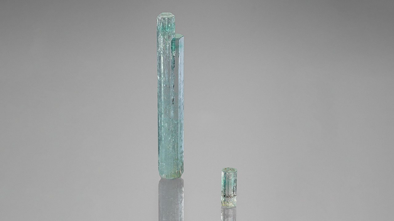 A unique new find of green beryl was discovered in 2024 in the Nasarawa Eggon mine in Nigeria. A few dealers at the Pueblo and Mineral City shows carried the material, referring to it as vanadium-bearing beryl (see above). Most of the stones had concentrated color-zoned bands near the terminations. Energy-dispersive X-ray fluorescence revealed iron and trace amounts of vanadium and chromium in the green zones, with the near-colorless areas primarily containing trace amounts of iron. The concentrated green color bands near the terminations exhibited pinkish orange fluorescence under long-wave (365 nm) UV light. The banding observed in these exciting new beryl samples is similar to that of Torrington emeralds from Australia.